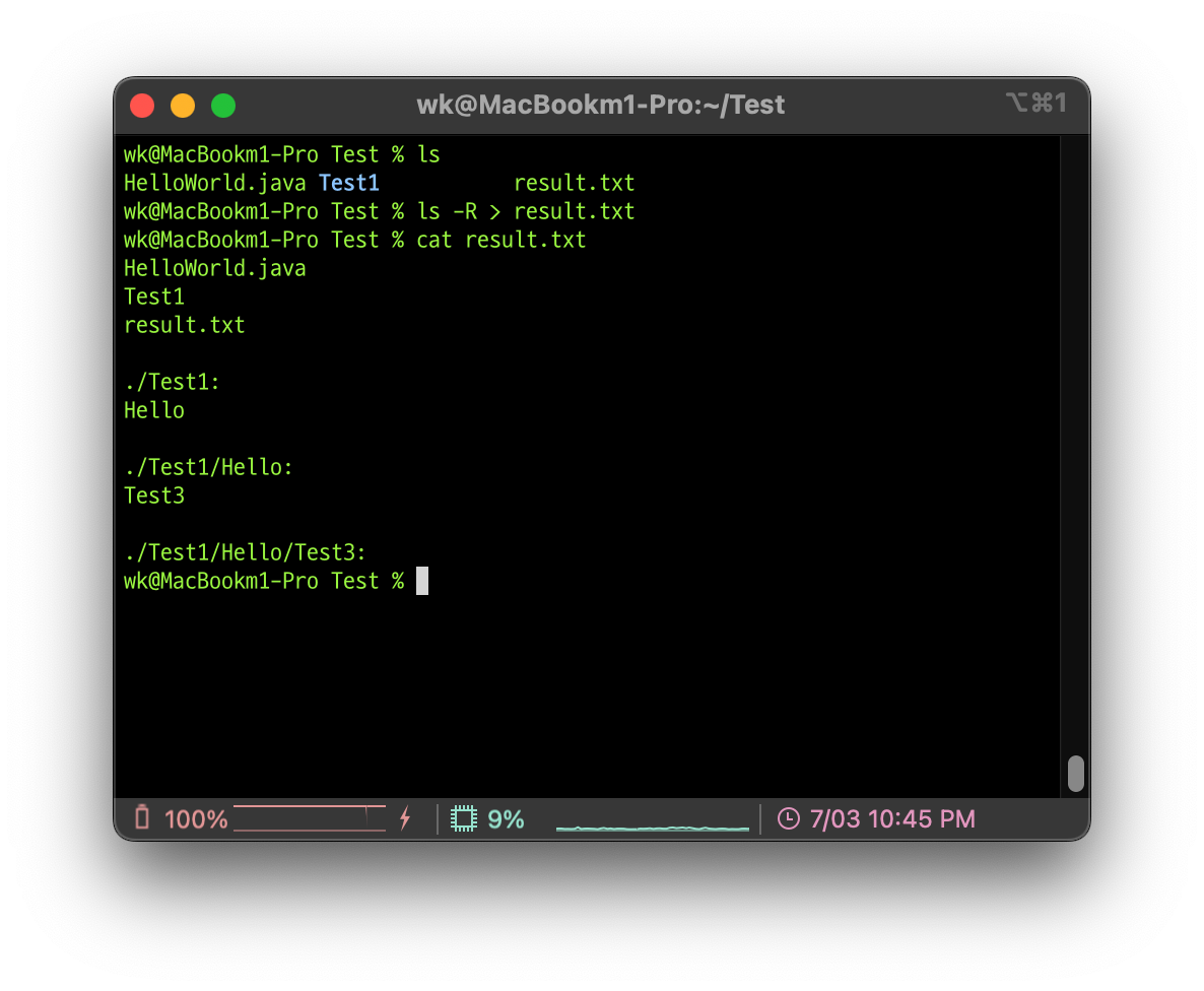 EX. 현재 디렉토리 내에 "result"라는 텍스트 파일이 존재하고 현재 디렉토리 내의 ls 출력 결과를 저장