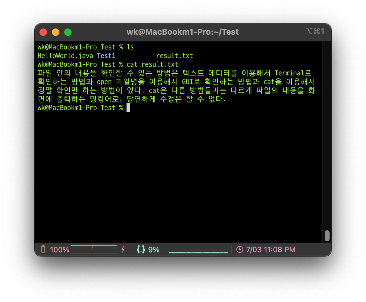 cat "파일명" # cat ./디렉토리/디렉토리/파일명 또는 cat /Users/사용자명/디렉토리/디렉토리/파일명 가능
