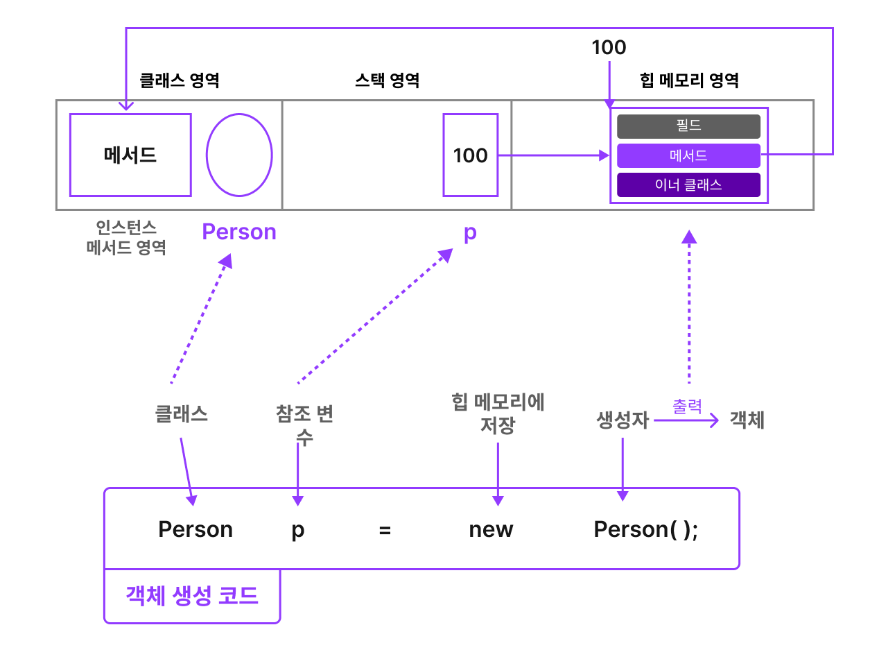 - 참조 변수 p : 스택 영역에 들어가며, 객체의 위칫값이 저장된다.