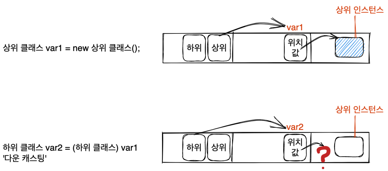 - 여기서 하위 클래스로 다운 캐스팅을 하면 가리킬 것(하위 클래스의 인스턴스)이 존재하지 않아 예외가 발생하며 프로그램이 종료된다.